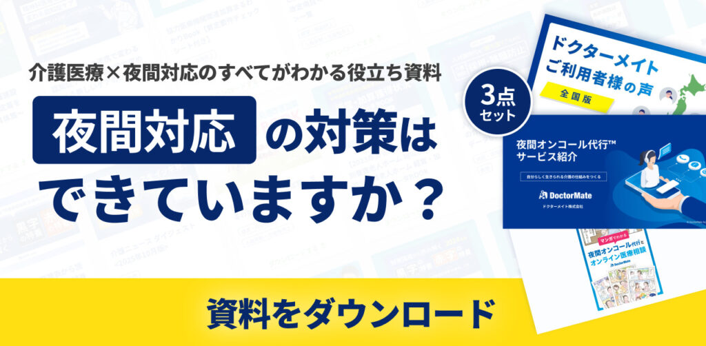 オンコール体制の維持は、スタッフの精神的・肉体的な負担が大きく、離職の引き金になることも少なくありません。そこでおすすめしたいのが、介護施設特化型の夜間オンコール代行サービス「ドクターメイト」です。