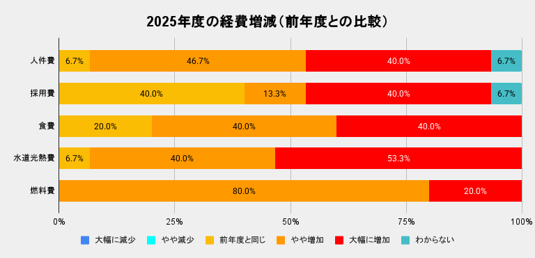 人件費、採用費、食費、水道光熱費、燃料費の5項目に絞って、2025年度の前年度との経費増減を聞いたところ、全ての施設で「前年度と同じ」もしくは「前年度よりも増加」という結果となりました。特に水道光熱費では半数以上の施設が「大幅に増加した」と回答しています。