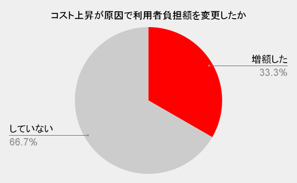 全ての施設で前年度よりも経費が増額していましたが、それを利用者負担額の増加という形で対応している施設は全体の3分の1ほどにとどまり、多くの施設が費用が増加しながらも施設負担でやりくりしていることが分かりました。