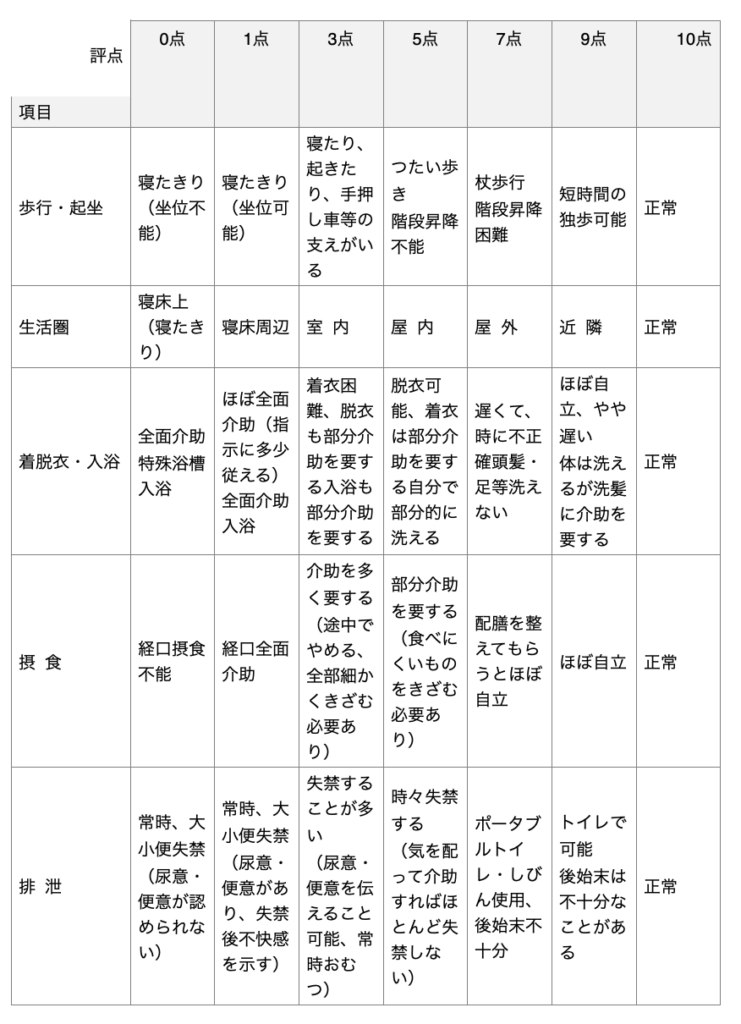 日本で開発されたADL評価尺度で、「歩行・起坐」「生活圏」「着脱衣・入浴」「摂食」「排泄」の5項目を 10 点満点で評価します。ケア提供者が評価対象者の日常生活を観察したり、時には対象者に質問するなどして評価を行います。10 点が正常 (自立)、 9点は自立して日常生活を営むことが困難になり始めた初期で境界、 7点が軽度の介助または観察を要する、 5点、 3点が中等度で日常生活に部分介助を要する状態、 1点、 0点は重度で全面介助を要する状態と判定します。この結果はケアプラン策定などに活用されます。