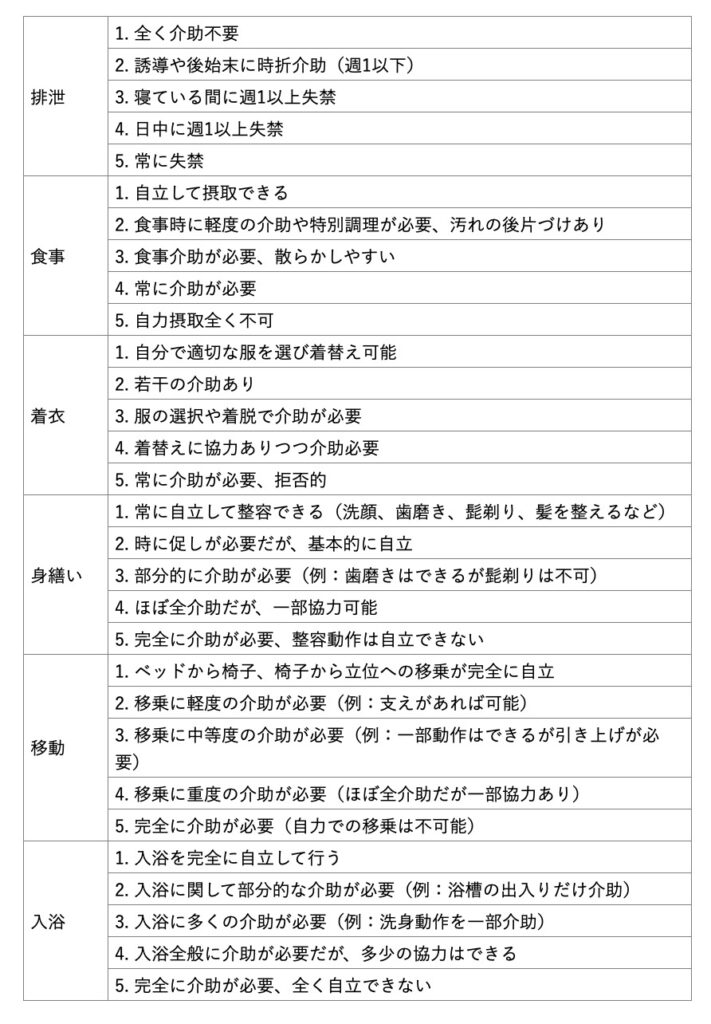 認知症を含む高齢者の基本的なADLを評価する目的で1969年に開発された尺度です。評価項目は「排泄」「食事」「着衣」「身繕い」「移動」「入浴」の6項目です。医師や介護専門職が各項目を5段階で評価します。その評価基準は以下のような形になります(各段階の表現は施設などによってやや異なる場合があります)。それぞれの段階の数字がそのまま各項目の点数になり、6~30点の範囲で点数が算出されます。