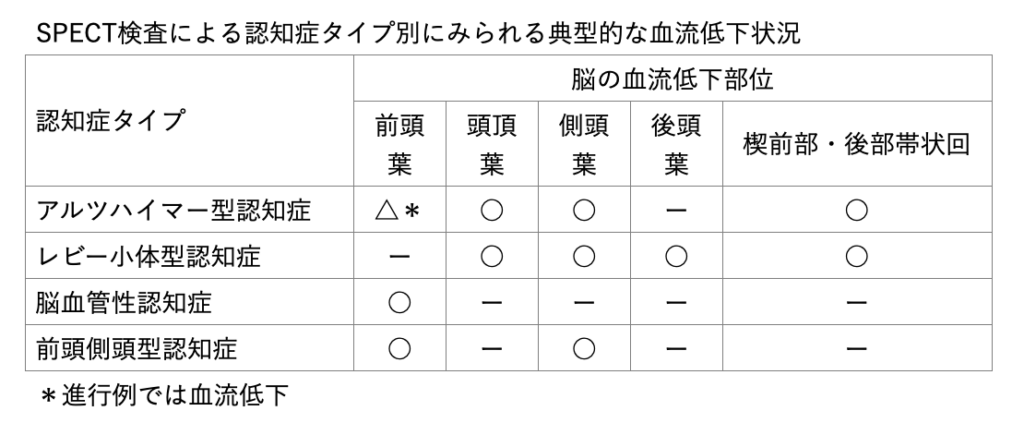 実際の検査ではこの検査で使用する放射性医薬品を静脈注射後、検査台に横になりSPECT装置で画像を撮影します。2方向撮影の場合、ガンマカメラは患者の頭部の周辺をグルグルと回転しながら画像を撮影します。3方向撮影の際は、ガンマカメラを組んで三角柱型にしたものに頭を入れて撮影します。撮影時間は約20~30分です。認知症タイプ別の脳血流低下の特徴は以下の票のようになります。