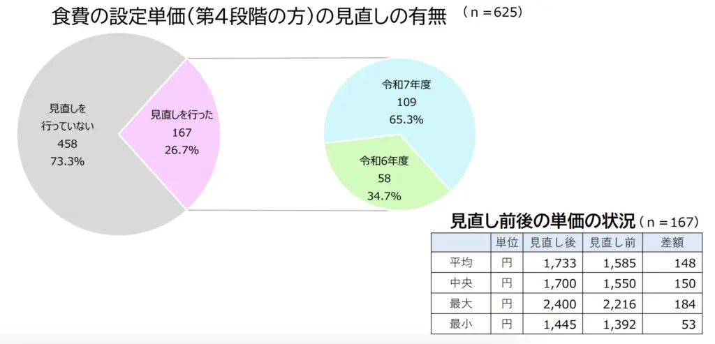 第4段階の方の食費の設定額について、2025年6月時点の平均額は1561.9円となり、2024年6月と比較して27.8 円増加していますが、半数以上の特養が基準費用額と同額の設定をしていることが分かりました。2024~2025年度にかけて食費の利用者負担額の見直しを行った特養は26.7%。見直し後の単価は平均1,773円であり、見直し前から148円増加しています。