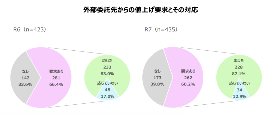 食事に関する外部委託先からの値上げ要求について、2025年度においては約6割の特養が「要求あり」と回答。うち、87.1%の特養でその値上げ要求に応じた、と回答しています。