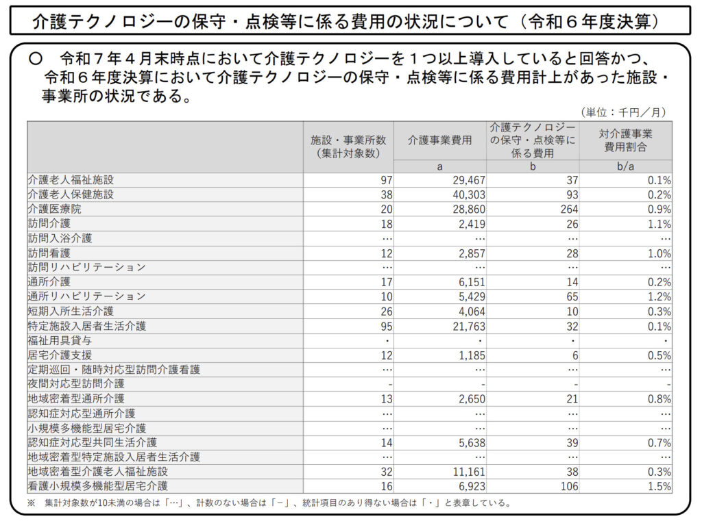 厚生労働省の社会保障審議会介護給付費分科会介護事業経営調査委員会が11月26日に公開した、令和6年度の介護事業者の経営状況調査において、同年度の介護テクノロジーの保守・点検等に係る費用の状況について集計結果が報告されています。
