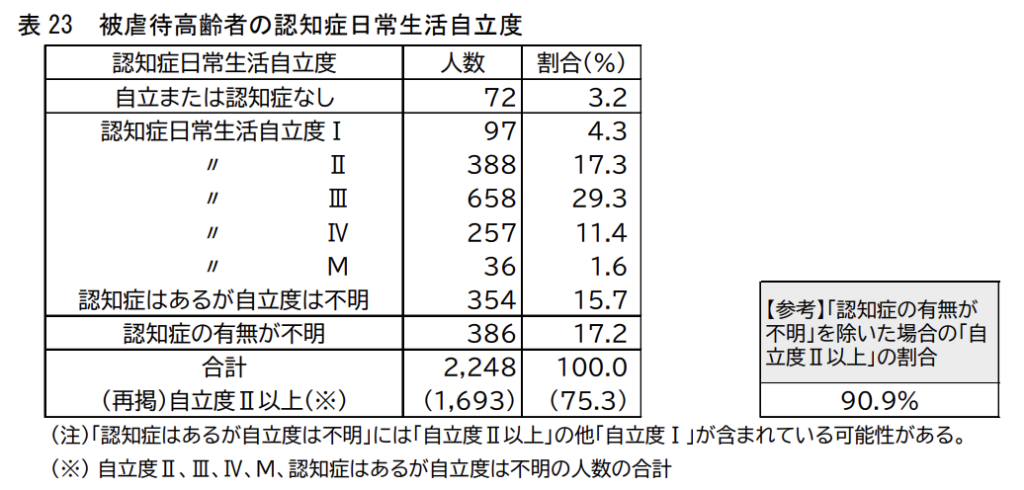 被虐待高齢者の認知症の程度について、日常生活自立度Ⅱ以上の者は 75.3%で。「認知症の有無が不明」を除いた場合、被虐待高齢者の約9割が該当することがわかりました。