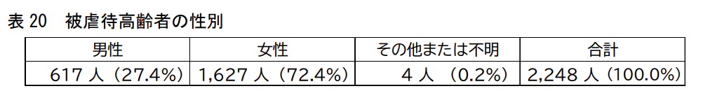 被虐待高齢者の性別については、「男性」が27.4%、「女性」が72.4%と、全体の約7割が女性、年齢については、「85~89歳」が23.2%と最も多く、次いで「90~94歳」が22.7%、「80~84歳」が16.0%、「95~99歳」が12.9%で、80歳以上が8割を占めていました。