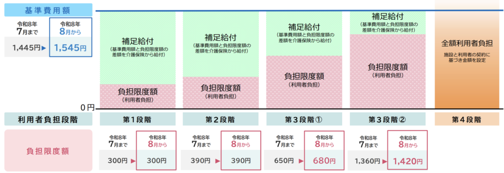 近年の食材料費の上昇や、食事の提供に要する平均的な費用の額と基準費用額との差が生じている状況等を踏まえ、令和8年8月より、基準費用額(食費) が100円/日引き上げられます。また、負担限度額(食費)について、在宅で生活する者との公平性等を総合的に勘案し、令和8年8月より、利用者負担第3段階(1)の利用者は30円/日、第3段階(2)の利用者について60円/日引き上げられます。