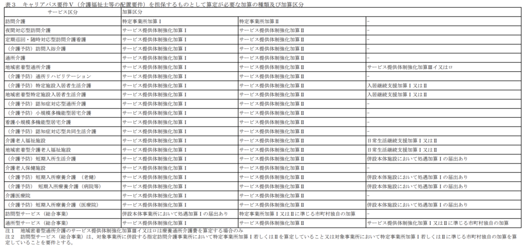 具体的には、処遇改善加算を算定する介護サービス事業所等又は当該介護サービス事業所等が併設している本体施設等においてサービス類型ごとにサービス提供体制強化加算、特定事業所加算、入居継続支援加算又は日常生活継続支援加算の各区分の届出を行っていること。