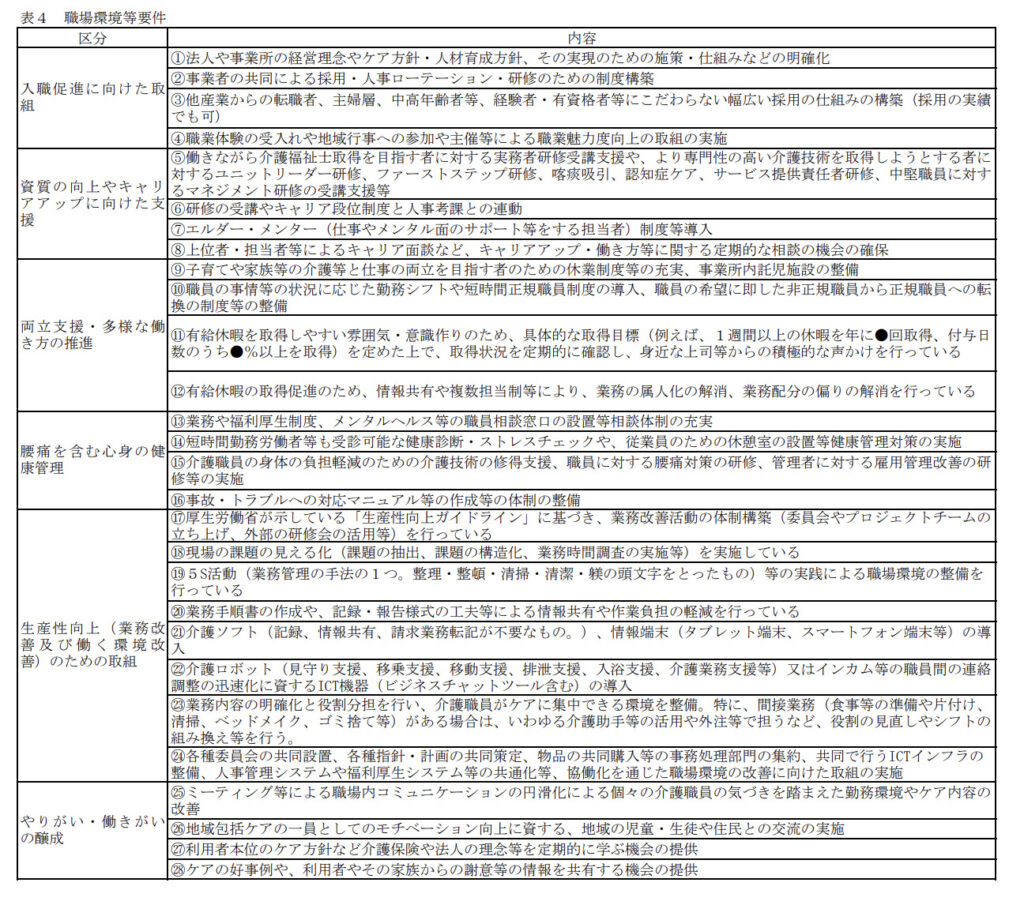「入職促進に向けた取組」、「資質の向上やキャリアアップに向けた支援」、「両立支援・多様な働き方の推進」、「腰痛を含む心身の健康管理」及び「やりがい・働きがいの醸成」の区分ごとに1以上の取組を実施すること。