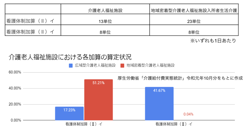 介護老人福祉施設の場合は加算(Ⅱ)のイとロがあります。いずれも看護職員の人員配置が利用者25名当たりの常勤換算方法で1人以上で、それ以降は端数を増すごとにさらに1人以上、なおかつ本体の基準の看護職員数よりも1人以上多く配置していることが条件です。そのうえで加算