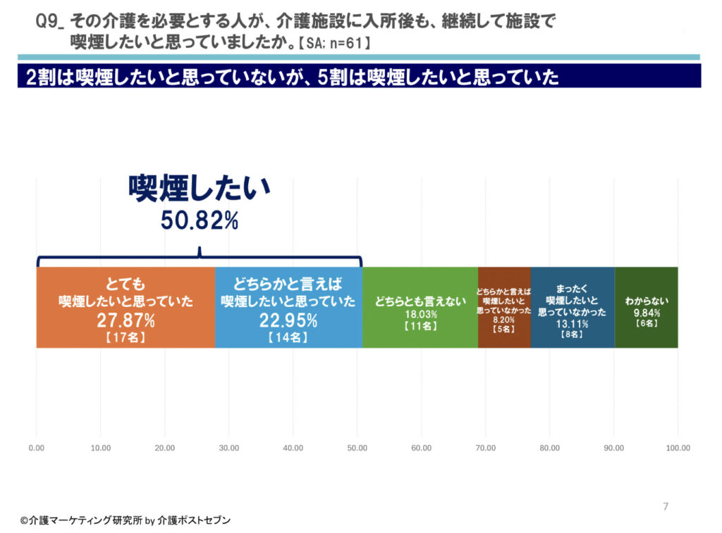 介護施設への入所前に喫煙していた人は19.5%。そのうち50.8%が「入所後も喫煙したい」と考えていました。