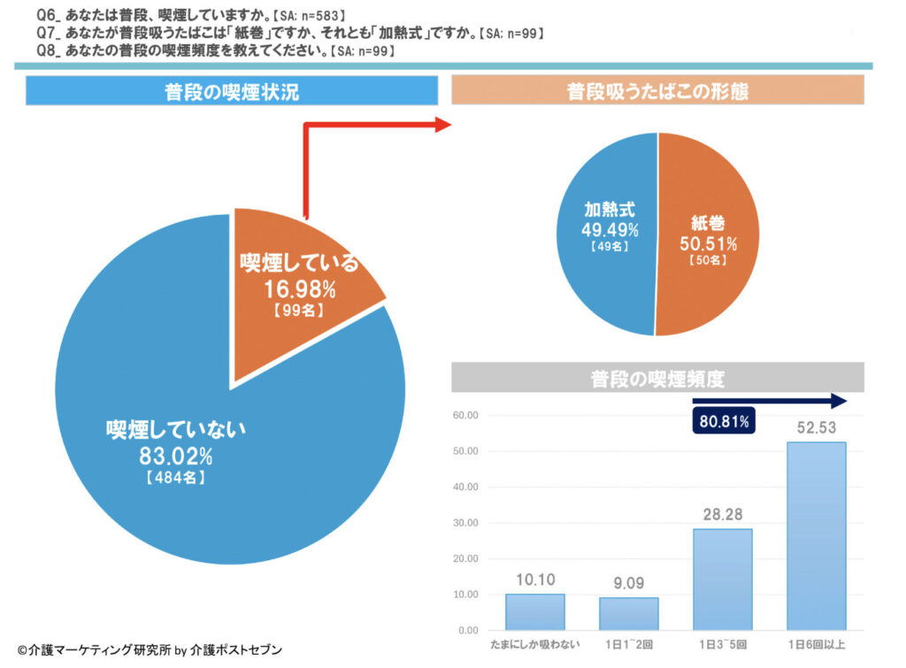 「介護マーケティング研究所 by 介護ポストセブン」が、介護施設の従業員583名を対象に喫煙実態調査を実施しました。