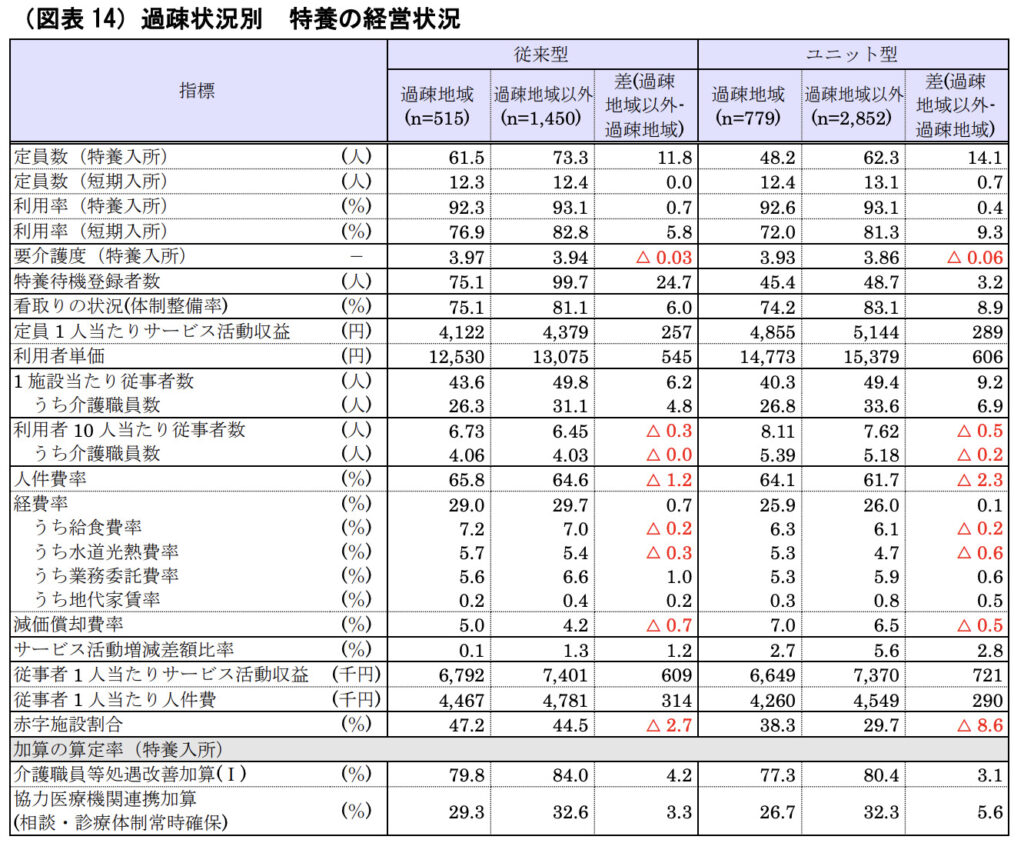 「過疎地域の持続的発展の支援に関する特別措置法」にて規定されている市町村とそれ以外の地域の2024年度の特別養護老人ホームの経営状況についても集計・分析が行われています。
