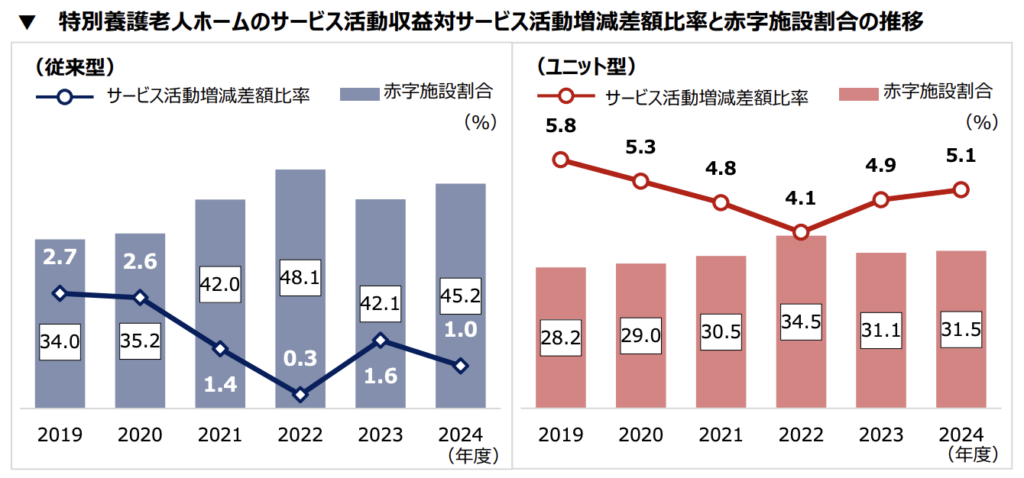 改定年度であった2024年度の経営状況を前年度と比較したところ、サービス活動増減差額比率は、従来型では前年度比0.5減の1.0%、ユニット型では前年度比0.2ポイント増加5.1%となりました。赤字施設割合は従来型で45.2%(前年度比2.1ポイント増)、ユニット型で31.5%(前年度比0.4ポイント増)となり、基本報酬の引き上げや各種新規加算が新設された改定年度も厳しい経営状況が続いたことが分かりました。