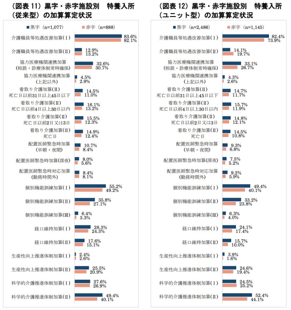 同機構では、従来型・ユニット型ともに黒字施設の利用者単価が赤字施設よりも高い一方、要介護度の差は小さいことから、黒字施設では赤字施設より積極的に加算を算定していることが示唆される、と分析しています。