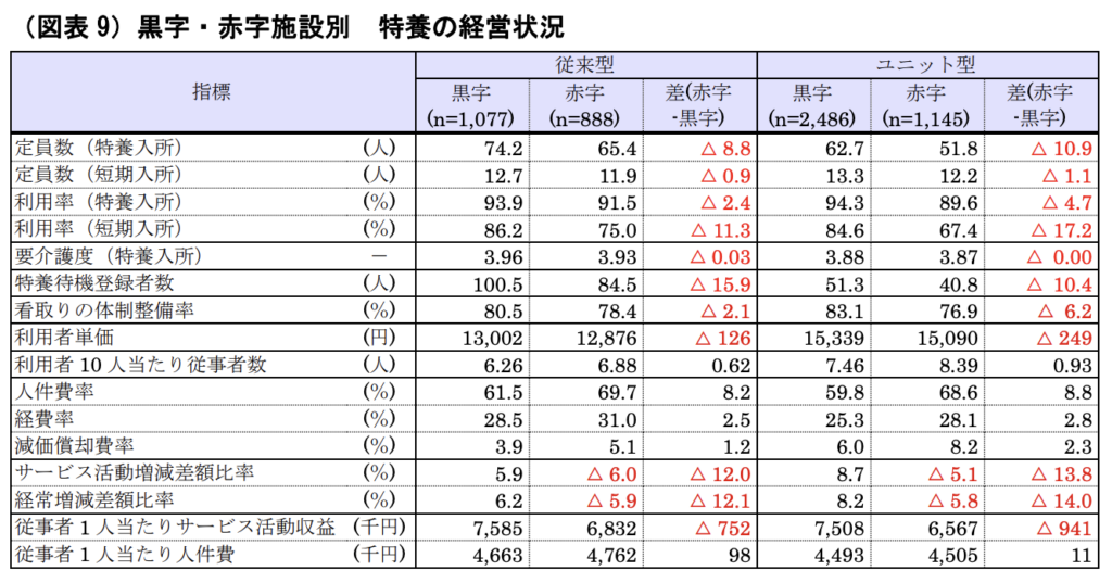 収益面では、従来型では特養入所の利用率が赤字施設が2.4ポイント低く、短期入所も11.3ポイント低くなりました。また、待機登録者数が15.9人少ないことが分かりました。利用者単価は赤字施設が126円低く、結果として従事者1人当たりサービス活動収益も752千円低い結果となりました。ユニット型も同様で、特に利用者単価では赤字施設が249円、従事者1人当たりサービス活動収益も赤字施設が941千円低くなっています。