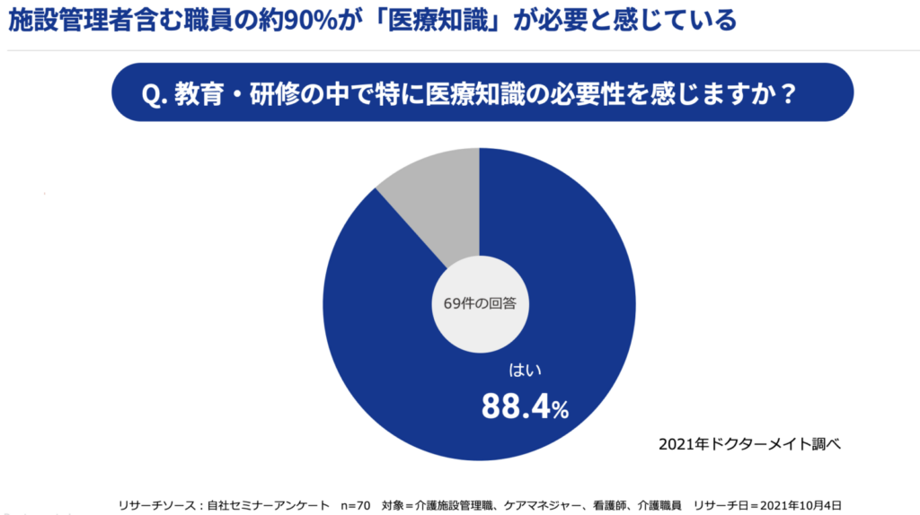 2021年にドクターメイトが実施した、介護施設管理職やケアマネジャー、看護師、介護職員ら70名を対象とした調査では、回答者の約9割が「教育・研修の中で特に医療知識の必要性を感じる」と回答しました。近年の介護報酬改定に伴い、施設にはより高度な医療対応と連携が求められています。こうした背景からも、介護現場における「医療教育」へのニーズは高まっており、専門性の高い知識の習得が現場の課題となっています。