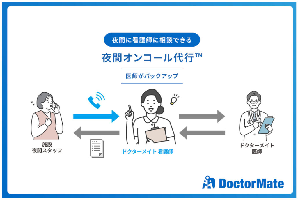 介護事業所向けに医療ソリューションを提供するドクターメイト株式会社(代表取締役・医師  青柳 直樹)では、2020年に販売を開始した介護施設向け「夜間オンコール代行™」における累計相談実績が、15万件を突破しました。2026年2月からは「夜間オンコール代行™」のオプションとして、夜間に看護師が介護施設にかけつけ、医療対応や、夜間の救急搬送発生時の医療機関への同行を代行する「夜間かけつけオプション」を東京23区を中心に2026年2月から、埼玉の一部でも順次提供を開始しています。